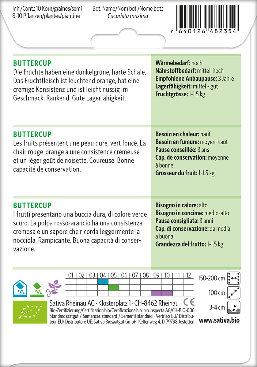 Cucurbita maxima - Die Früchte haben eine dunkelgrüne Schale, das Fruchtfleisch ist leuchtend orange, hat eine cremige Konsistenz und ist leicht nussig im Geschmack. Rankend. Gute Lagerfähigkeit. Fruchtgewicht ca. 1 - 1.5 kg. Kürbisse brauchen genügend Dünger und Wasser. Jungpflanzenaufzucht bringt ausgereiftere, aromatischere und besser lagerfähige Früchte. Junge Pflanzen sind schneckenempfindlich. Lagerung bei 8-10 Grad.