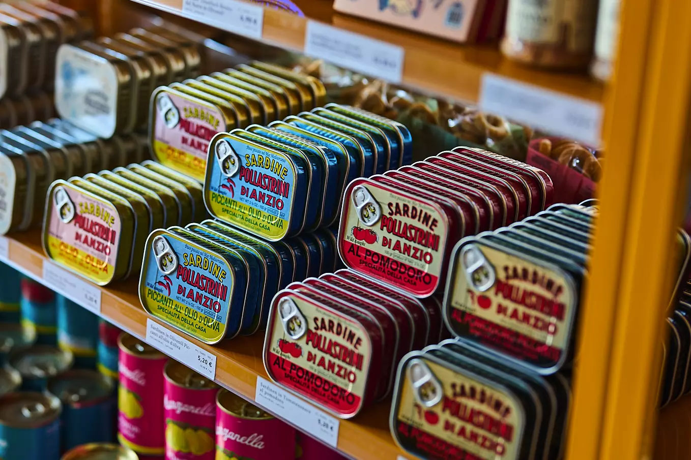 Die frisch gefangenen Sardinen aus dem Mittelmeer werden im Hafen von Anzio bei Rom direkt in der Konservenfabrik Pollastrini verarbeitet. Per Hand werden sie ausgenommen und vorbereitet, frittiert und dann in die Dosen gelegt. Darüber kommt eine pikante Tomatensauce nach Familierezept. Pollastrini ist der einzige Sardinendosenproduzent Italiens.