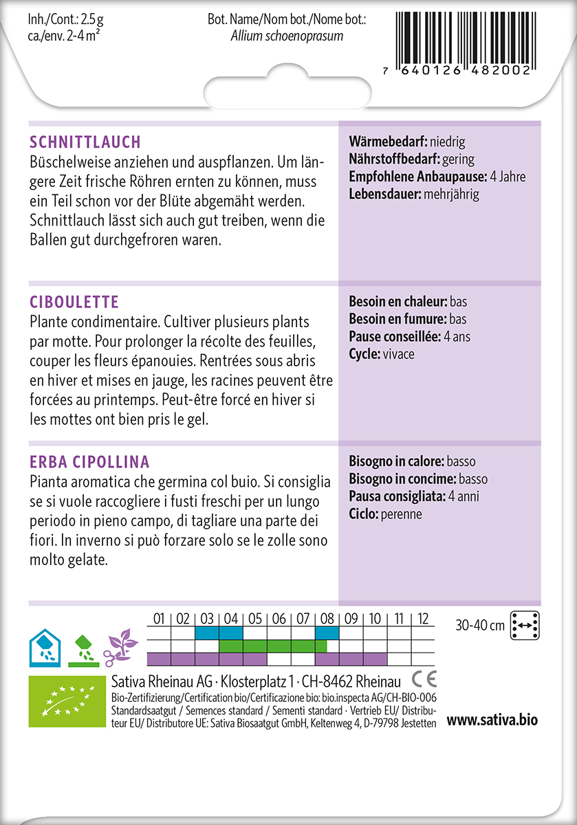 Wüchsig, mit mittelstarken, straffen Halmen. Bekannte und viel verwendete Würzpflanze. Büschelweise anziehen und auspflanzen. Dunkelkeimer. Um im Freien längere Zeit frische Röhren ernten zu können, muss ein Teil schon vor der Blüte abgemäht werden. Schnittlauch lässt sich auch gut treiben, wenn die Ballen gut durchgefroren waren. Abstand 30-40 cm zwischen den Reihen. Geringer Nährstoffbedarf.