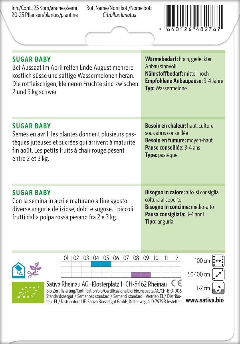 Bei Aussaat im April reifen Ende August mehrere köstlich süsse und saftige Wassermelonen heran. Die rotfleischigen, kleineren Früchte sind zwischen 2 und 3 kg schwer. Aussaat im Haus bis Mitte Mai sinnvoll. Nur in warmen, geschützen Lagen ist ein Freilandanbau sinnvoll. In Frühbeetkästen oder Folientunnels ist der Anbau gut möglich. Nicht zu stark düngen und wässern. Bei Bodenkultur Haupttrieb nach dem 4. Blatt kappen und gegen Fäulnis Brettchen unter die Früchte legen.